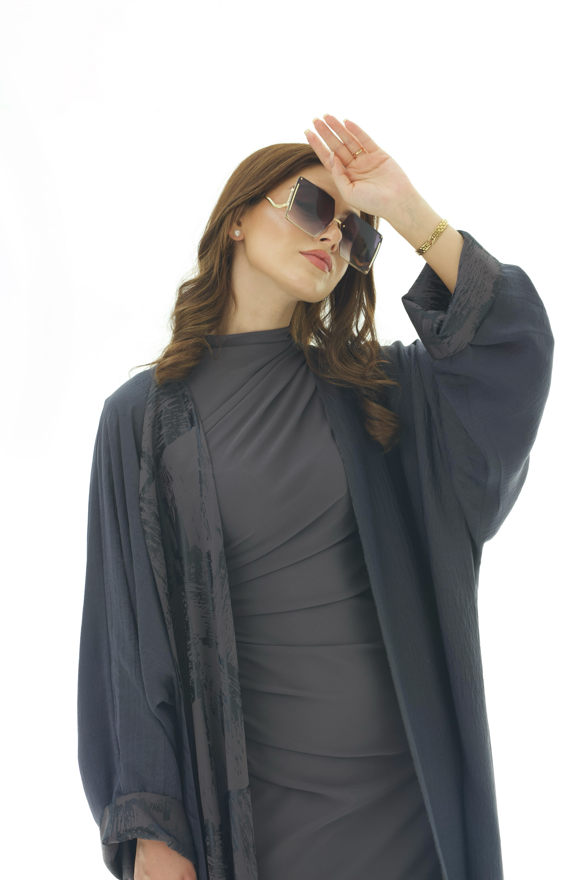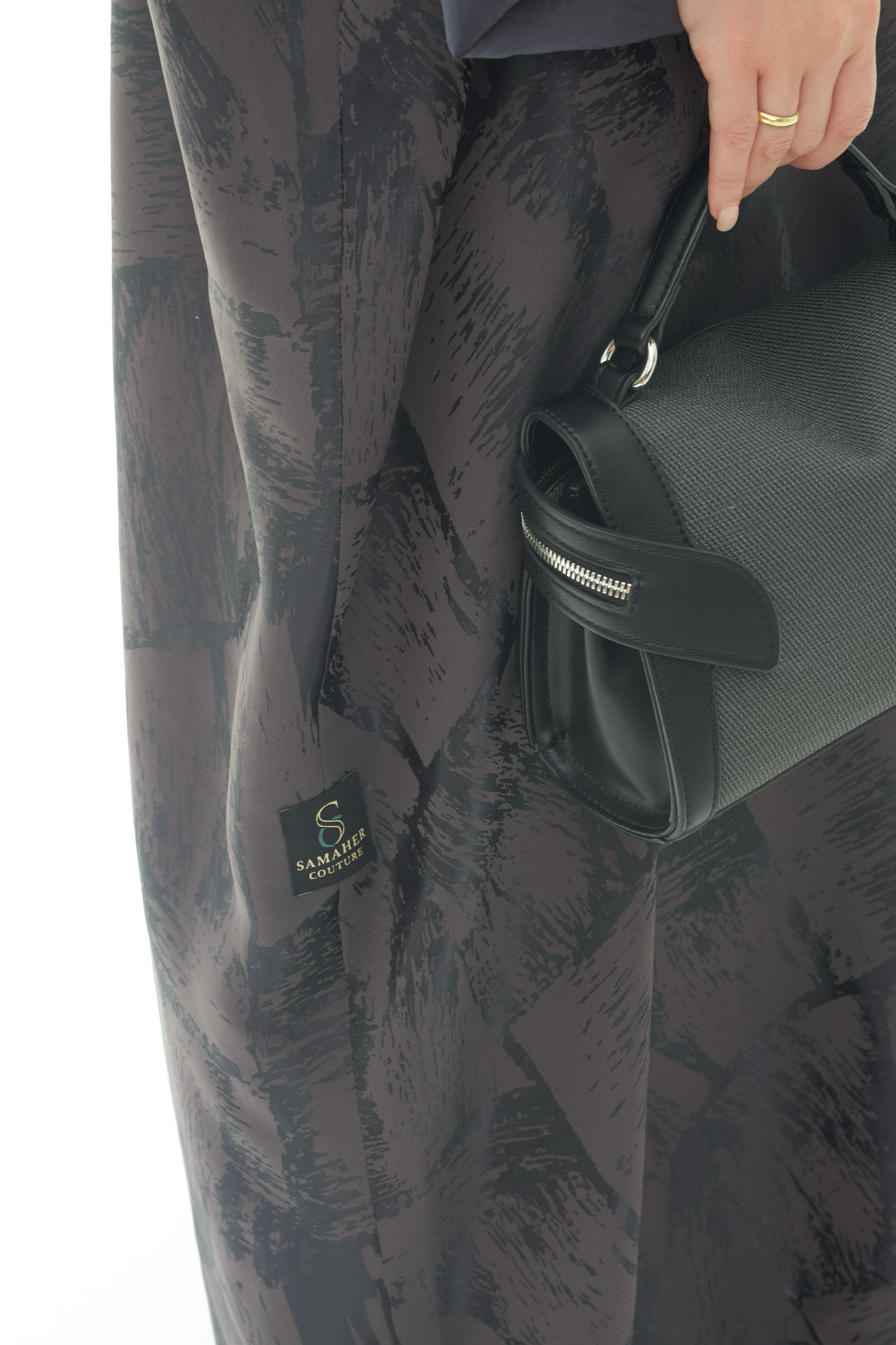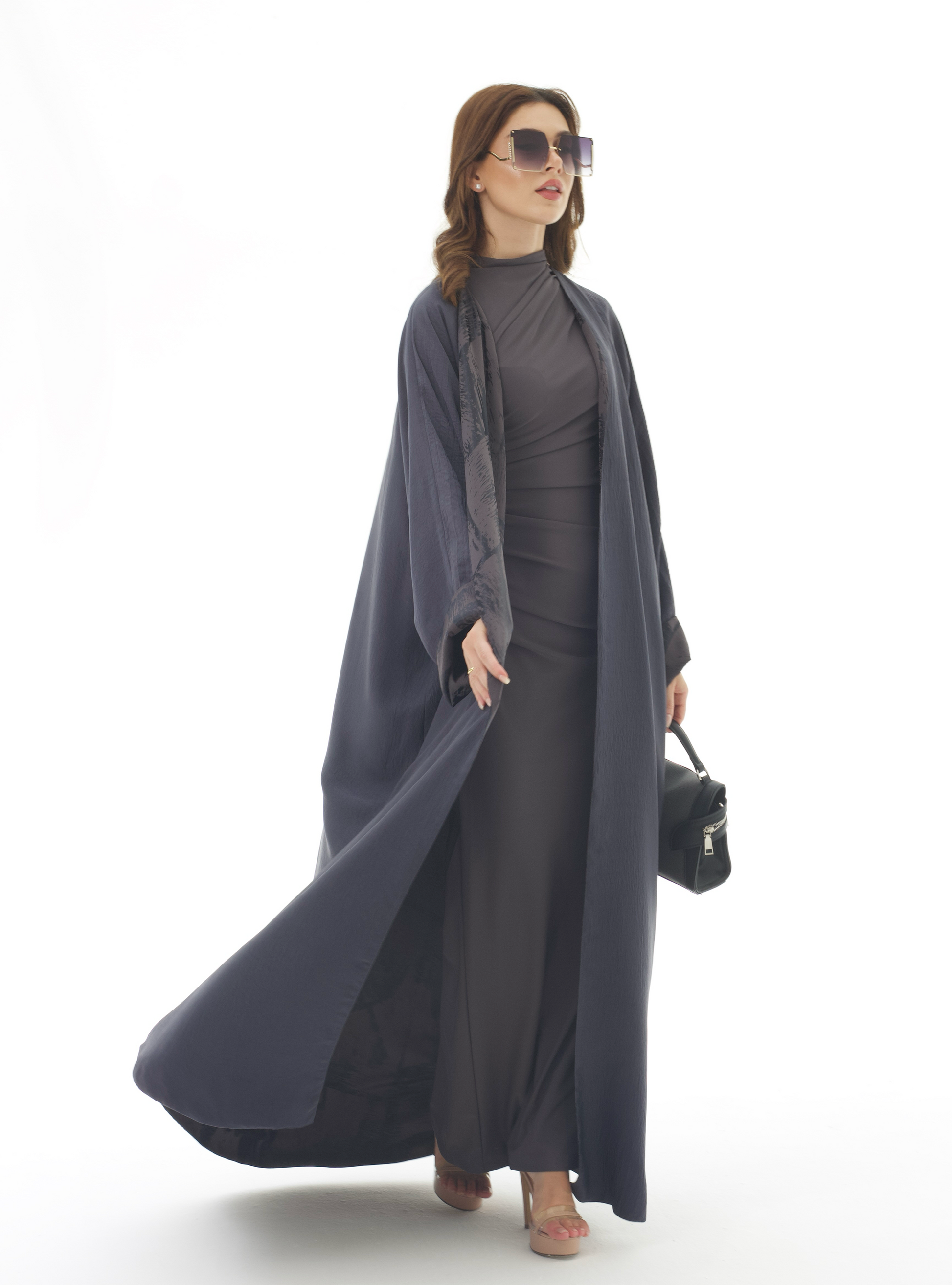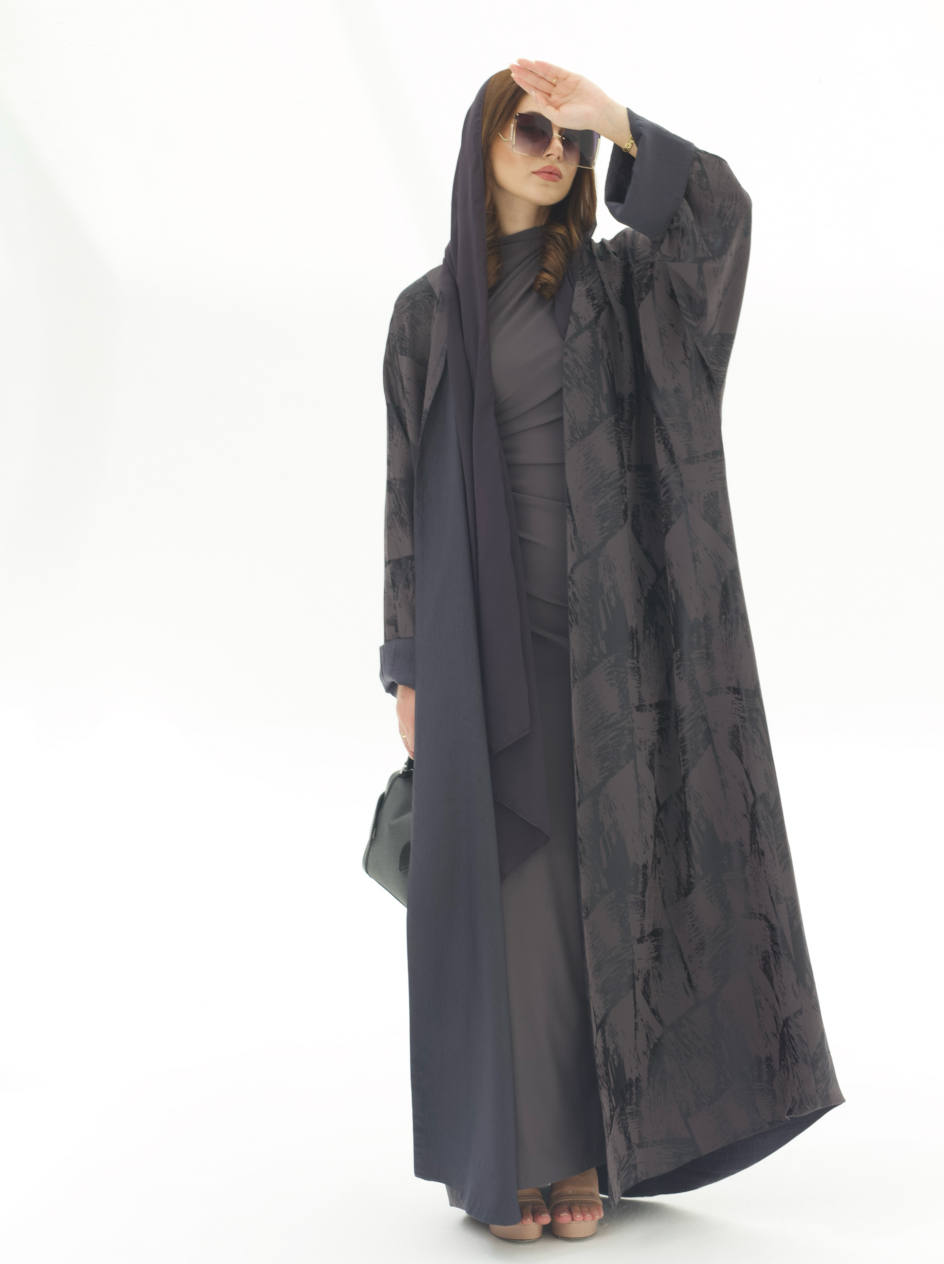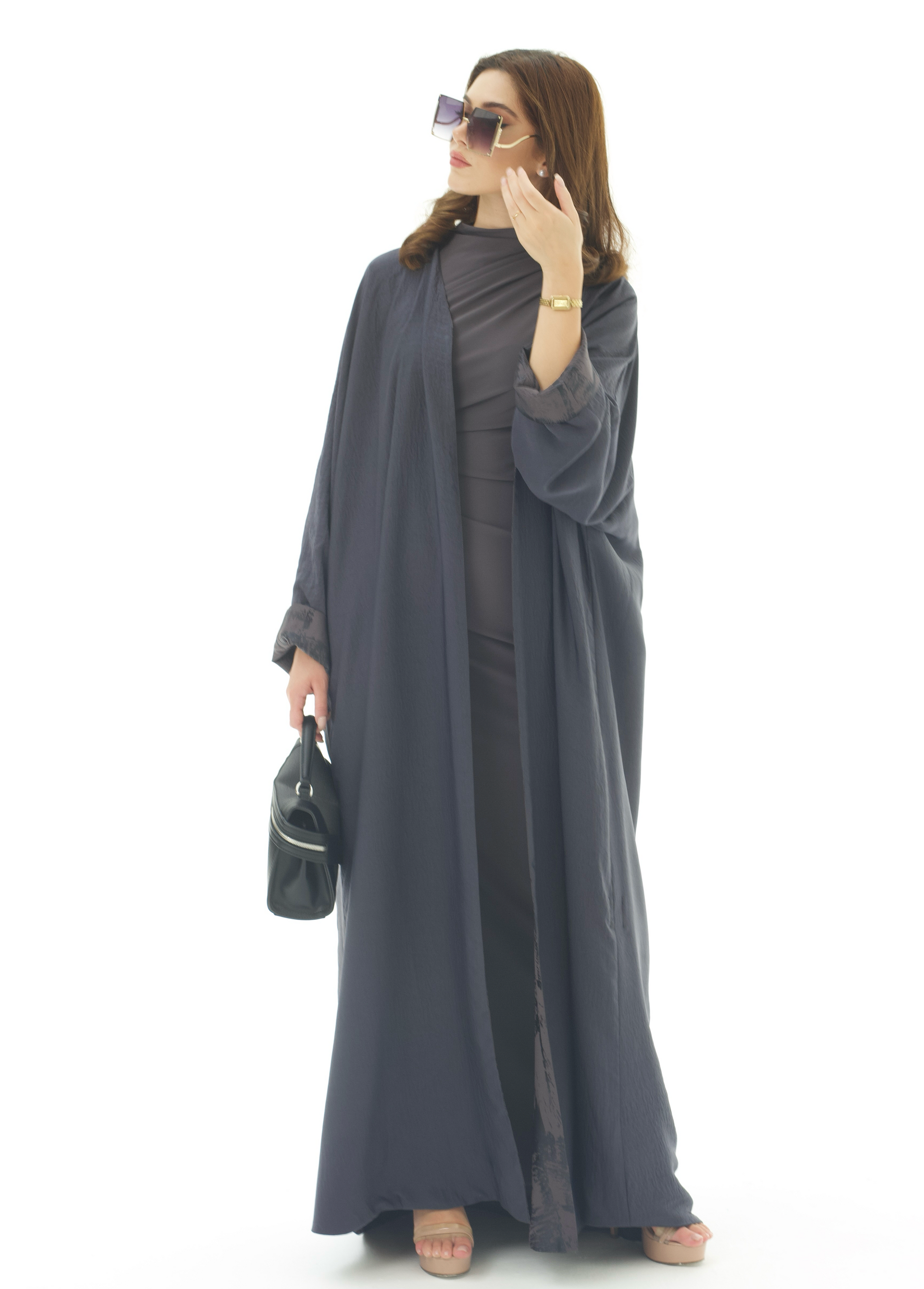 يجتمع في هذه العباية اللون الداكن مع التفاصيل المنقوشة بانسجام أنيق يعكس فخامة التصميم. بقصتها الفضفاضة وانسيابيتها الناعمة، توفر ظل راحة عملية مع مظهر أنثوي أنيق يناسب الإطلالات الرسمية واليومية.