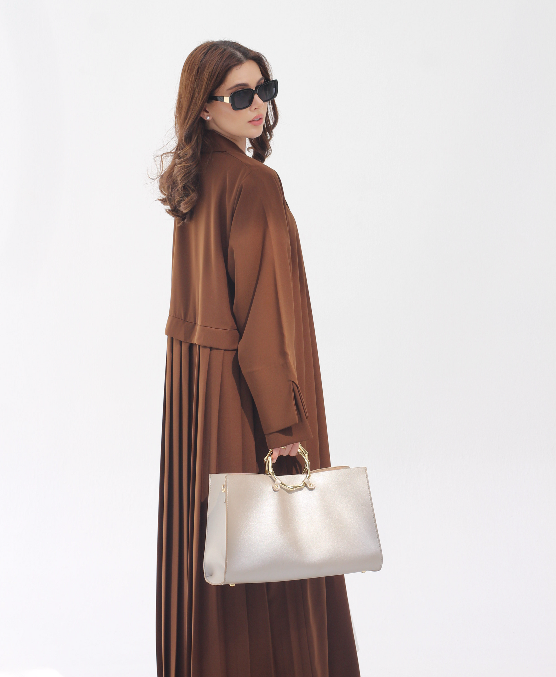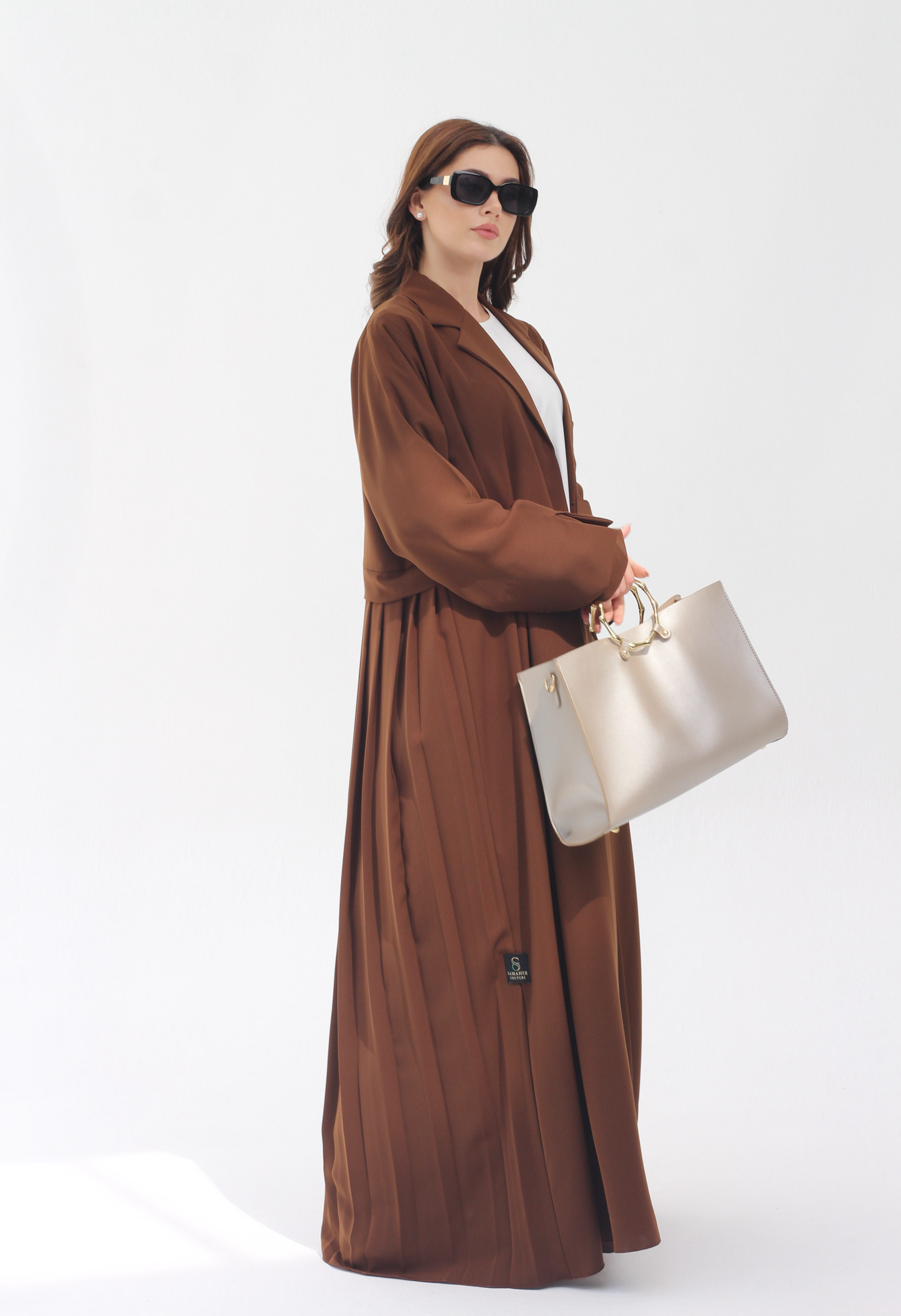 تتألق عباية الكستناء بلونها البني الدافئ الذي يعكس الفخامة والدفء في إطلالة واحدة. صُنعت من قماش كريب عالي الجودة يتميز بانسيابيته وملمسه الناعم، لتمنحك راحة مثالية وأناقة متجددة.
