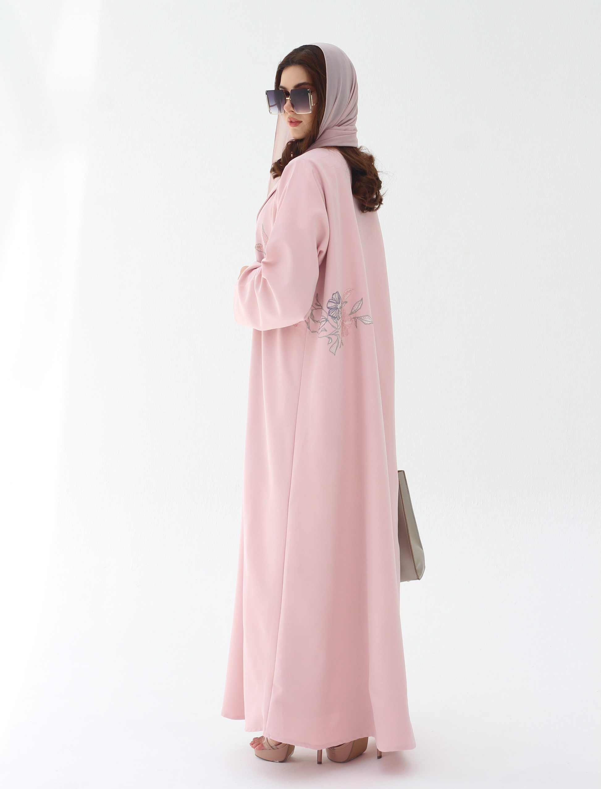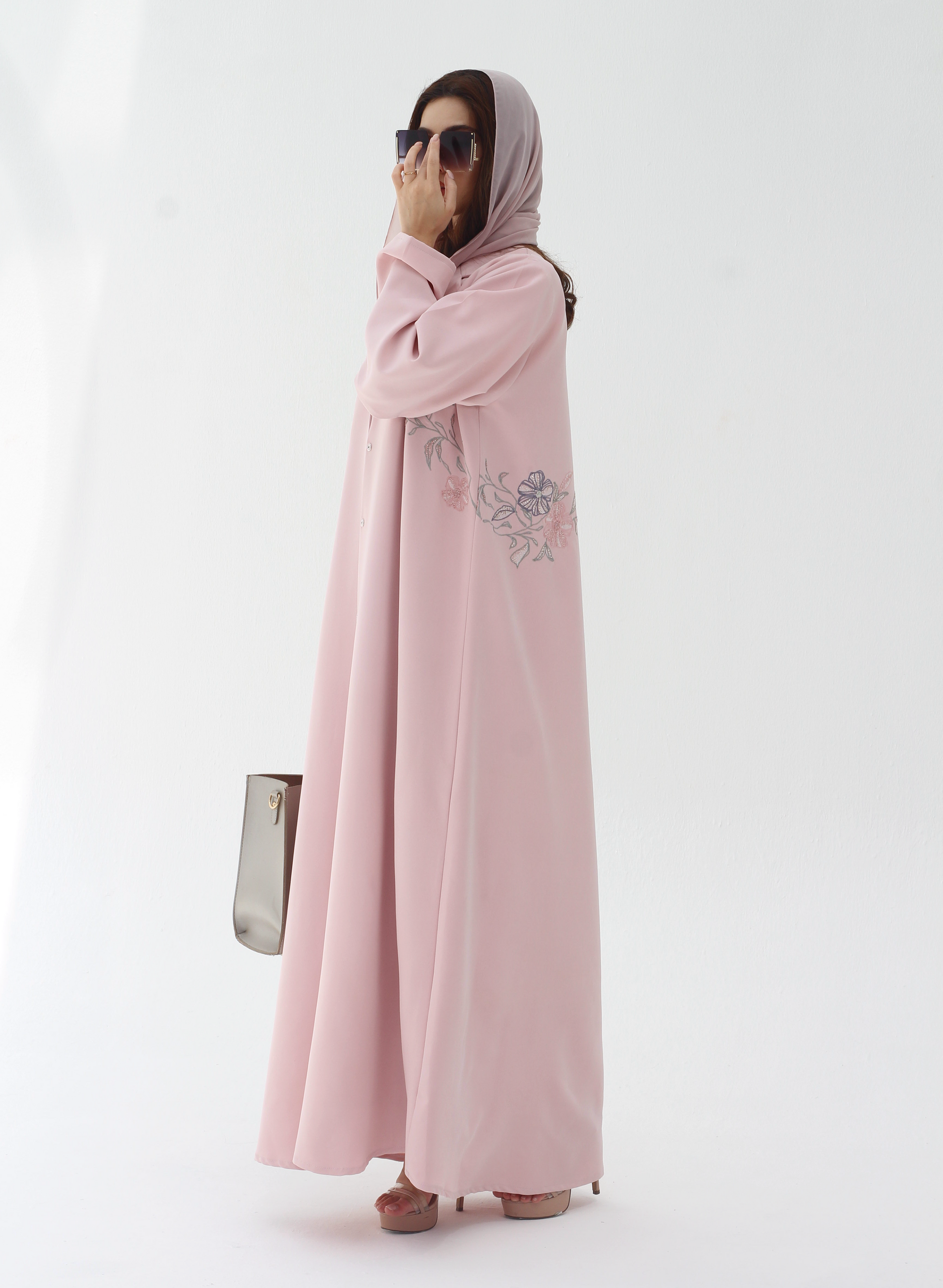 يزدان التصميم بتطريز زهري أنيق على الجانبين، يضيف لمسة فنية مميزة تجعل العباية قطعة فريدة تواكب خطوط الموضة العصرية. تأتي بقصّة فضفاضة وانسيابية تمنحك حرية الحركة، وتُسهّل تنسيقها مع مختلف الإكسسوارات والحقائب لإطلالة أنيقة تناسب اليومي والمناسبات الخاصة.